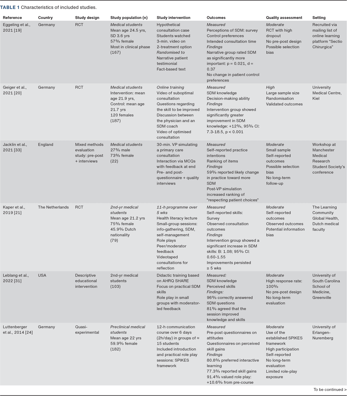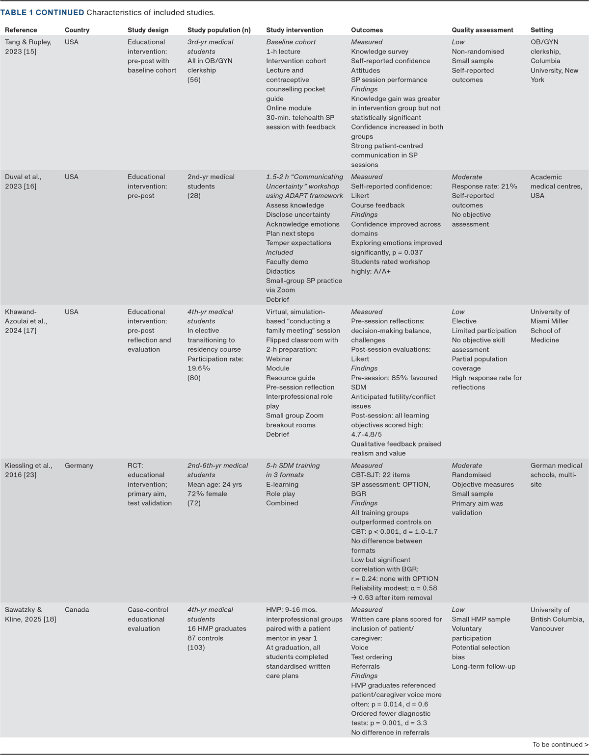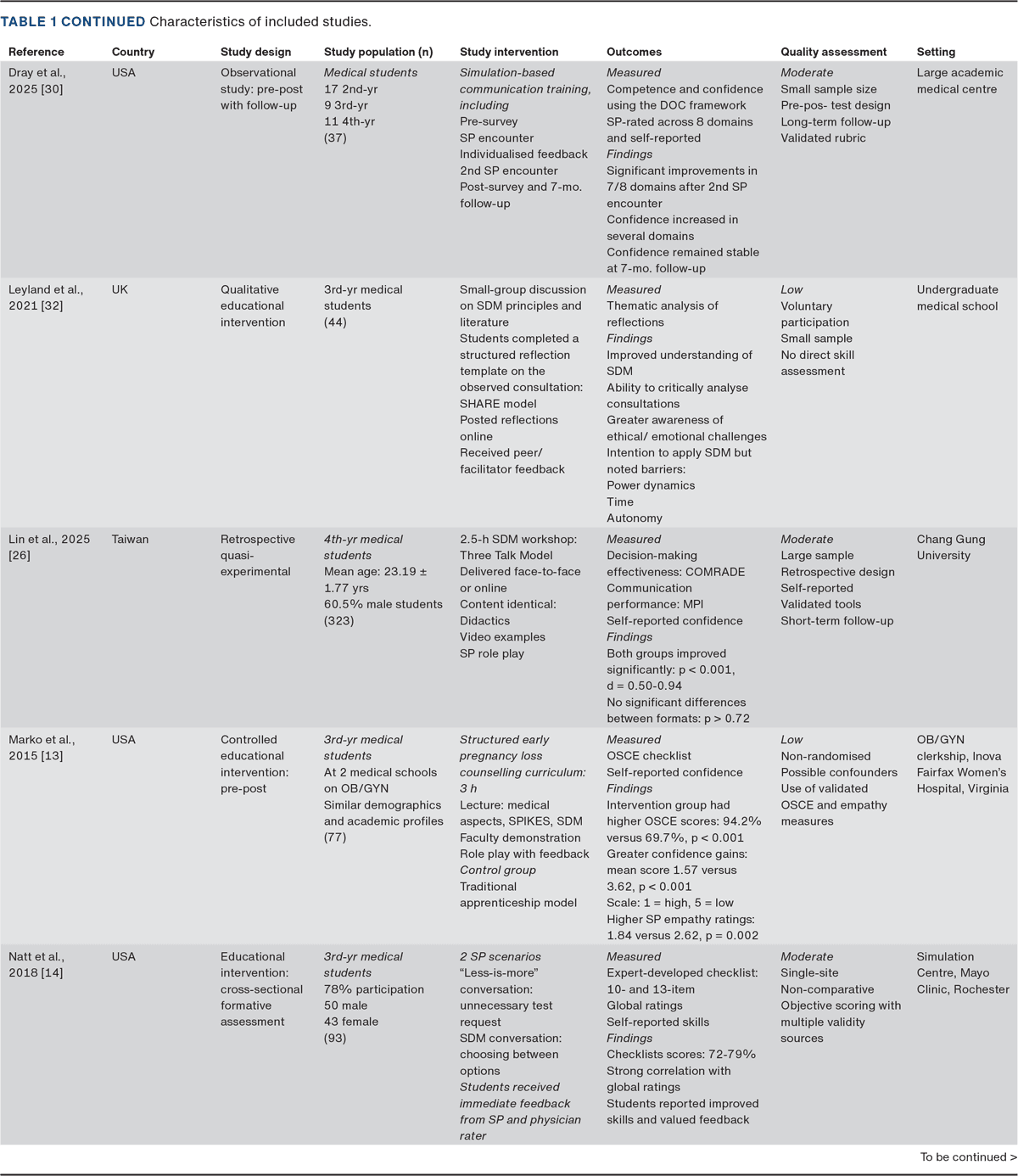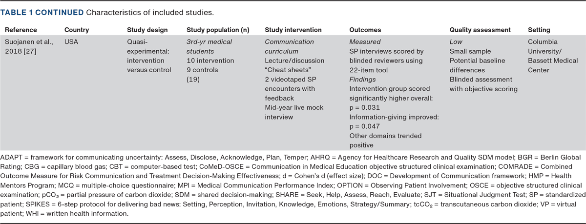 RESULTS. Teaching approaches varied widely, most often involving role-play with SPs or peers, case-based discussions and blended or online modules. Despite heterogeneous outcome measures, experiential methods consistently enhanced students’ confidence, communication and attitudes towards SDM. Most studies relied on self-reported data rather than validated, performance-based tools, and few studies included follow-up.