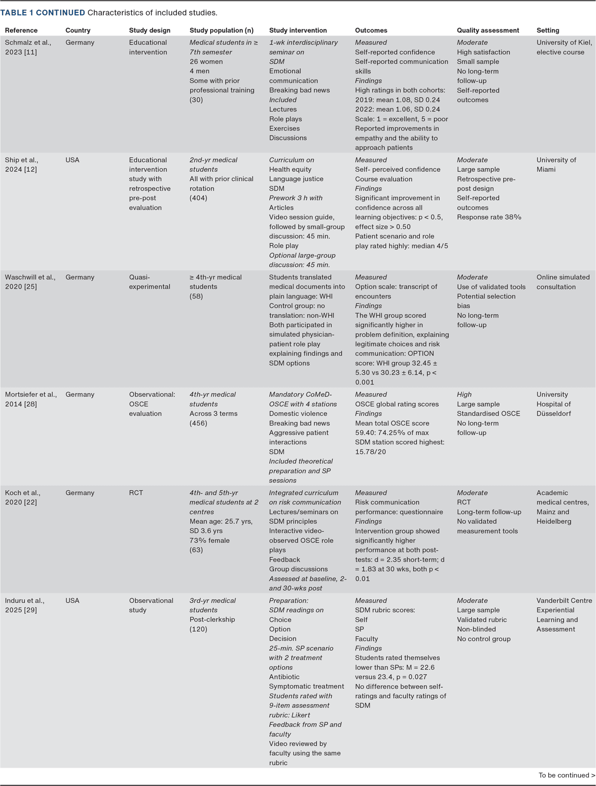 Future studies should employ more rigorous designs to address current limitations in SDM training research. Larger, multi-centre randomised trials with standardised interventions are needed to clarify which teaching strategies yield lasting gains. Longitudinal designs are particularly important to determine whether improvements in knowledge, confidence and communication skills persist in clinical practice.