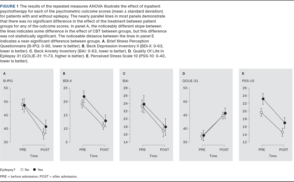 On the second and third objectives, we found a significant effect of inpatient CBT at discharge across all the scores. This applied to patients with PNES + epilepsy (P+E) and patients with only PNES (P-only). This implies that the same CBT intervention can be used for patients with PNES regardless of the presence of comorbid epilepsy.