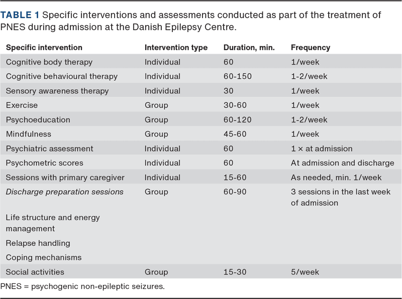 CBT can be provided in an outpatient or an inpatient setting, but the scientific evidence is limited, especially for inpatient treatment. The few existing studies show a significant benefit of CBT in terms of seizure reduction and improvement of psychometric scores [8-10]. No Danish studies on inpatient treatment of PNES have been published.
