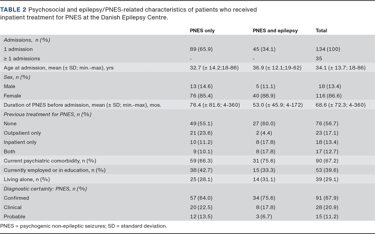 In this study, our cohort of 122 patients who received inpatient treatment for PNES comprised mainly younger women, of whom 67% had psychiatric comorbidity, and approximately 40% were employed or in education. Overall, our cohort was similar to other published cohorts.