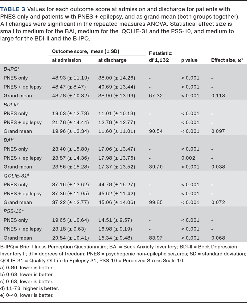 Concerning the effect of the inpatient treatment programme, we found a significant difference in all the psychometric scores from admission to discharge. Table 3 summarises our findings on the effect, including separate post-hoc analyses for patients with PNES only and patients with PNES + epilepsy.
