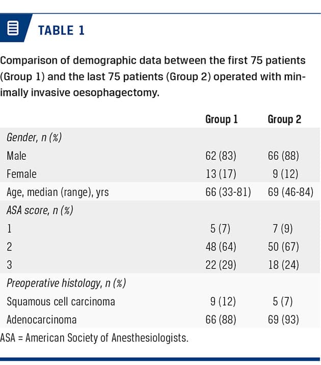 metastatic disease, planned open procedure or cervical anastomosis). Demographic data for the first 75 patients (Group 1) and the final 75 patients (Group 2) are shown in Table 1. There was no difference in gender, age, ASA score or preoperative histology between the two groups. Quality measures regarding surgery are
