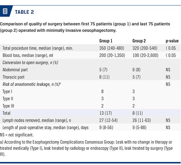 Stomach Cancer Group [6]. Age, gender, preoperative histology, American Society of Anesthesiologists (ASA) score, total procedure time, blood loss, conversion rate (abdominal and thoracic part registered separately), anastomotic leakage (according to the Esophagectomy Complications Consensus Group [7]), complications (according to Clavien Dindo [8]), number of removed lymph nodes, LOS, 30- and 90-day mortality rates, and the one-year survival rate were registered. In order establish if any changes had occurred in the post-operative outcome over time, the patients were divided into two equal groups: The initial 75 MIO-operated patients (Group 1) and the final 75 MIO-operated patients (Group 2). Two-sample Wilcoxon rank-sum test was used for comparison. Patients were followed until