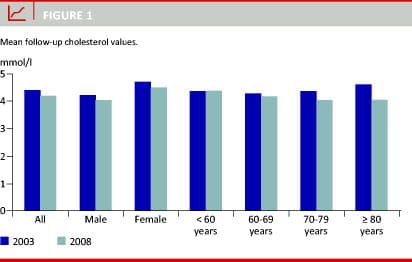 The data were tested for normality, and further analysed considering sex and age groups. An unpaired t-test was used to compare mean statin adherence (number of tablets/days) together with mean cholesterol values in the 2003 and 2008 cohorts. Fisher’s exact test was applied to evaluate changes in statin MPR ≥ 80% and the proportion of individuals with cholesterol < 4.5 mmol/l. STATA statistical software, version 11.0 was used for statistical analysis.
