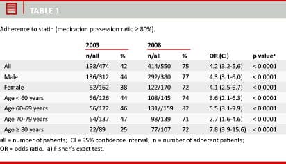Conclusion: Over the five-year period from 2003 to 2008, statin adherence and cholesterol values significantly improved. However, room for improvement remains, particularly in younger patients.