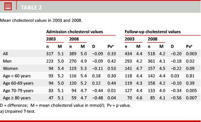 Cholesterol values in the 2003 and 2008 cohorts were analysed and compared. The first cholesterol value was drawn at the time of the index AMI (admission ±1 day), and the last cholesterol value was defined as the latest value obtained during the two years of follow-up. In addition, the proportion of patients reaching a total cholesterol value < 4.5 mmol/l within the follow-up period was registered.