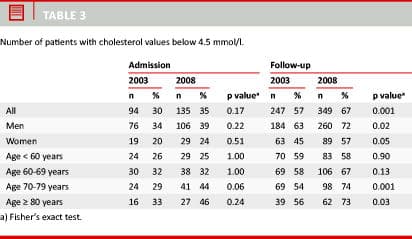 Generally, no significant difference in the overall frequency of patients with an admission cholesterol < 4.5 mmol/l was noted. However, in the age group 70-79 years, the level of significance was reached. At follow-up, significantly more patients in the 2008 cohort demonstrated cholesterol levels < 4.5 mmol/l. The difference was significant for both men and women and in the age groups 70-79 years and ≥ 80 years, Table 3.