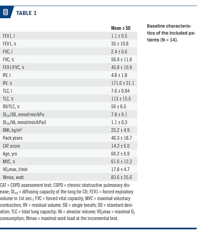 Among 16 screened patients, 14 were randomised and completed the study. The baseline demographics and clinical characteristics of all randomised patients are shown in Table 1. The mean age was 66 years, seven had very severe COPD (FEV1 < 30% of the predicted value), six had severe COPD (FEV1 30-50% of the predicted value) and one patient suffered from moderate disease (FEV1 50-80% of the predicted value) COPD. The mean FEV1 (± SD) was 35% (± 10.8) of the predicted value. The mean (± SD) W-max for the incremental work test at screening was 83.6 W (± 25.6).