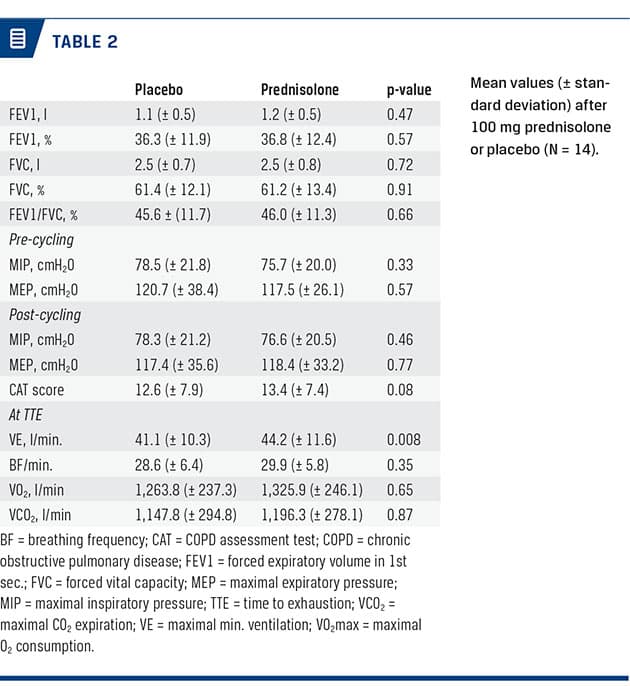 METHODS: In a double-blinded crossover design, patients were randomised to either 100 mg of prednisolone or placebo. The study consisted of a baseline visit and two study visits, each seven days apart. The primary endpoint was time to exhaustion (TTE) on an ergometer bike using a submaximal exercise test on 70% of the maximal workload. On every study visit, spirometry, the COPD Assessment Test, maximal inspiratory/expiratory pressure and maximal voluntary contraction of the quadriceps muscle were measured. A total of 14 male patients with grade C/D COPD were randomised.