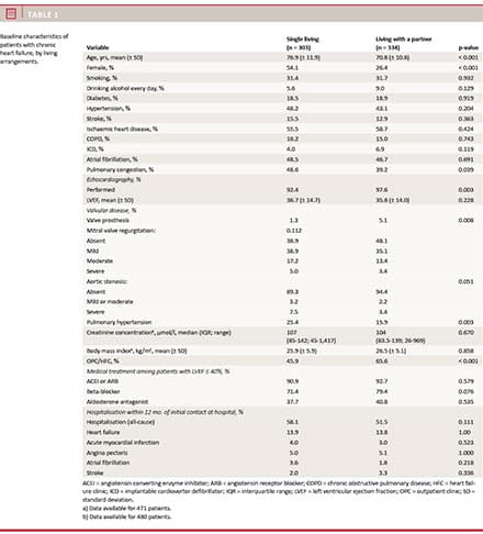 Several prognostic determinants have been identified in patients with HF [1]. Social support has a significant impact on health and well-being in general [2], and it has been associated with better self-care and good treatment adherence among patients with HF [3]. Single living is an easy-to-measure proxy for a low level of social support in a wide variety of patient populations, and several studies have shown a negative impact of single living on survival [4, 5]. Although studies suggest an association between social support and outcome among patients with HF, there are conflicting results [6-9]. Furthermore, there are also conflicting data regarding differences in relative risk between genders [5, 10-12].