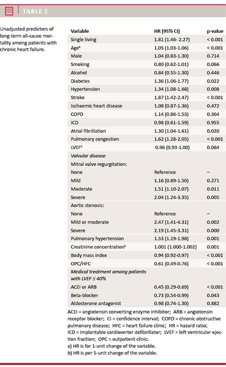 living with a partner (model II) as reference (Table 3). Other variables associated with shorter survival in unadjusted analyses were old age, diabetes, hypertension, stroke, atrial fibrillation, pulmonary congestion, reduced LVEF, moderate and severe MVR, AS, pulmonary hypertension and increasing creatinine (Table 2). Follow-up in the OPC or the HFC clinics, increasing values of body mass index and treatment with angiotensin-converting enzyme inhibitors and angiotensin receptor II blockers were associated with better post-discharge survival (Table 2).