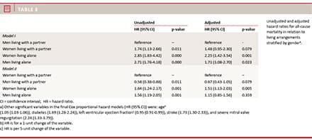 The unadjusted hazard ratios (HR) are given in Table 2. After stratification of living arrangements by gender, it was found that both single-living men and women had a significantly increased risk of death with either men living with a partner (model I) or women