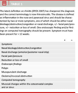 Chronic rhinitis and chronic sinusitis are terms that are often used separately. Since consensus was reached as formulated in the 2007 European Position Paper on Rhinosinusitis and Nasal Polyps (EPOS), the correct term has been chronic rhinosinusitis (CRS) [1, 2]. CRS is defined as inflammation in the nose and paranasal sinus and it is characterized by two or more cardinal symptoms. Either endoscopic signs or computed tomography (CT) changes should be present. A CT was not an option in our study and the diagnosis therefore rests on symptoms and endoscopy. Disease duration is defined as > 12 weeks. If the person was known in advance with a diagnosis of CRS and had been receiving medical treatment, the diagnosis stated was that which appeared in the person’s medical history. The EPOS definition of CRS is shown in Table 1.