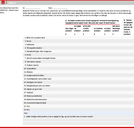 The English SNOT-22 was forward backward translated by an English/Danish interpreter according to standard procedures [10, 11].