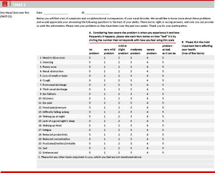 The present study is based on the EPOS criteria described above. SNOT-22 contains 22 questions on CRS-related symptoms. Symptom severity is graded zero to five – with zero indicating no problem at all and five indicating the worst possible symptom. For each item, scores are added to produce a sum score on a scale ranging from zero to 110 with high scores indicating a large rhinosinuitis-related health burden. The patients are also asked to identify which five items are most important to them. At the end of the questionnaire, the patient may state if he or she has had any symptoms that were not included among the 22 items. The questionnaire invites the patient to indicate symptoms experienced over the past two weeks.