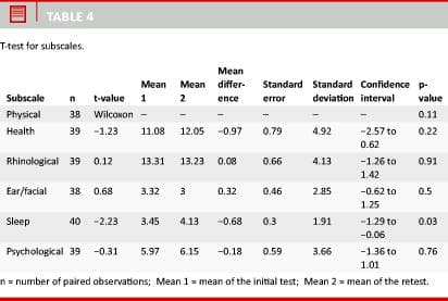 Pearson’s correlation analysis was calculated for each item with a mean value of 0.70 (p < 0.001). Thus, a good correlation was obtained between the scores of the initial test and the retest. For the six subscales, Pearson’s correlations were physical 0.82, health 0.87, rhinological 0.83, ear/facial 0.58, sleep 0.87 and psychological 0.78.