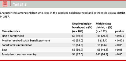 The study was a register-based follow-up study of a child cohort identified in 1987 and followed from 1999 through 2006. The study groups consist of 108 children born in 1978 who lived in the deprived neighbourhood of Vollsmose and 152 children from a nearby middle-class district born in the same year. The children were identified through the regional schools. The sample was assumed to be almost complete because of mandatory schooling provisions. Through the Central Population Register Number (CPRN) of the children – a 10-digit unique identifier attributed to all Danish citizens since 1968 – socioeconomic and family-related data were obtained from the records of the local municipal authorities. Table 1 shows social characteristics of the children and their families from the two districts. In the deprived neighbourhood, significantly more children lived with a single parent, with a mother on social benefit or disability pension, and had been registered by the authorities due to cases of abuse or violence in the family. The number of boys and the number of children of immigrant parents were also slightly higher in the deprived neighbourhood than in the more privileged district.