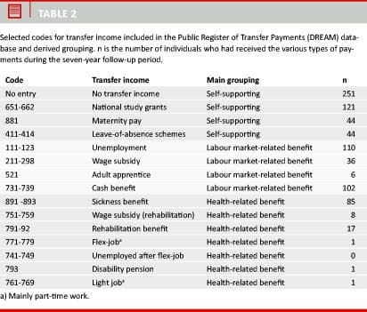 Details concerning employment between the ages of 21 and 27 years were collected for all participants. Information on unemployment before the age 21 years was not used because a high proportion of the cohort was assumed to be in full time education up to that age and therefore not at risk of unemployment. Employment data were obtained from the Public Register of Transfer Payments (DREAM) in which individual records are linked on the basis of the CPRN. The DREAM database operates with more than 100 different codes falling into three main groups: self-supporting, labour-market-related benefits and health-related benefits (Table 2). The three most frequently used welfare payments during the observation period were unemployment benefit, cash benefit and sickness benefit. Four per cent in each study group had been awarded a disability pension during the follow-up period.