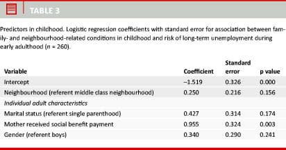 In the logistic regression model (Table 3), living in different neighbourhoods during early childhood did not predict a future higher risk of long-term unemployment. The only individual variable found to be significantly associated with long-term unemployment was having a mother receiving social benefits. Single parenthood and gender were not related to long-term unemployment.