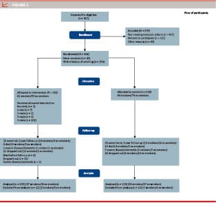 In the intervention group, 15 of 57 (26%) of baseline current smokers versus eight of 56 (14%) of controls had stopped smoking (p = 0.112). Among baseline ex-smokers, three of 48 (6%) in the intervention group and six of 67 (9%) of controls had relapsed to smoking (p = 0.594).