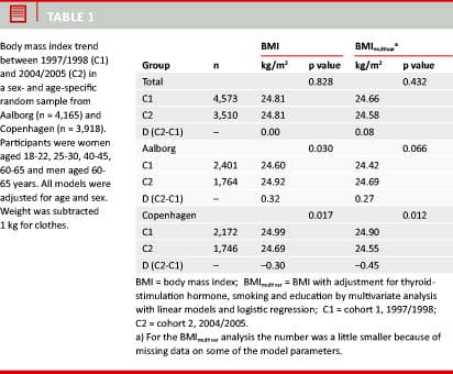 Our results showed an unchanged average BMI from 1997/1998 to 2004/2005 in the total cohort reflecting a possible stagnation in the BMI trend in Denmark. However, there was a marked difference in the change of BMI when we compared the two Danish regions of Aalborg and Copenhagen. We observed a significant increase in average BMI in Aalborg in the period, while a decrease in average BMI was observed in Copenhagen. According to the absolute BMI values, people were not in general more overweight in Aalborg than in Copenhagen, they were simply less overweight in 1997/1998 and have subsequently reached about the same level of BMI as seen in Copenhagen in 1997/1998.