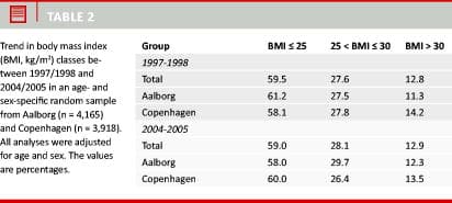 In Aalborg, a trend towards an increase in BMI in all age groups from 1997/1998 to 2004/2005, but it did not reach a level of statistical significance in any of the age groups.