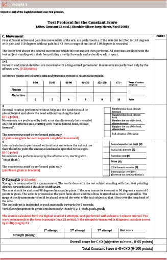 The CS, which was originally developed as a scoring system for the evaluation of functional outcome in patients with general shoulder disorders, is widely used internationally and recommended by the ESSSE, but at the same time often criticised for relying on imprecise terminology and for lack of a standardised, internationally accepted test protocol.