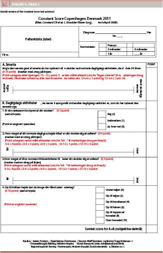 As treatment modalities for shoulder diseases evolve and new treatments are introduced, the need for assessment of functional outcome is increasing. The Constant Score (CS) [1] was among the first shoulder score systems developed and is considered the most commonly used scoring system for evaluation of various disorders of the shoulder [2]. The CS assesses subjective and objective shoulder function with respect to: A: pain; B: activities of daily living; C: range of motion and D: strength (Figure 1). The CS is often used to evaluate treatment progress and to compare results of clinical trials for several specific shoulder disorders [2-4]. The European Society for Surgery of the Shoulder and Elbow (ESSSE) and the Journal of Shoulder and Elbow Surgery recommend the CS for use in research on shoulder disorders [2, 5]. Nevertheless, it has been criticised for relying on imprecise terminology and for diffuse definitions of methodlogy in the original description of the score [2, 6, 7]. Thus, a standardised test protocol is not available. This has left room for different interpretations and use of the score between centres [7]. To address these weaknesses, Constant et al published a guideline paper in 2008 with recommendations for modifications of the original CS [2]. However, no standardised test protocol was included in these new recommendations and the validity and usefulness of the score therefore remains questionable. The need for a standardised test protocol was further emphasised in a 2010 systematic review of the psychometric properties of the CS [8]. Moreover, the CS revised in accordance with the newly modified guideline has not been translated and adapted into Danish.
