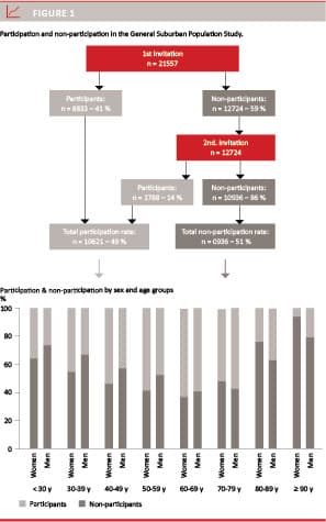 GESUS was initiated in January 2010 with ongoing enrollment and is a cross-sectional study of the adult Danish suburban general population in Naestved Municipality (70 km south of Copenhagen; including postal codes 4160, 4171, 4250, 4262, 4684, 4700, 4733, and 4736). The criteria for invitation are Danish citizenship and a Danish Civil Registration number (CPR, a unique identification number assigned at birth to all Danes) indicating Danish residence. All persons aged 30+ and a random 25% selection of the population aged 20-30 years are invited by mail in numerical order starting with citizens born on the 1st in every month and continuing. If individuals have not responded within three weeks of their scheduled attendance period, a reminder is sent with a new scheduled period. A completed paper-questionnaire is a prerequisite for attending the health examination. For this study, we included participants and non-participants from 11 Jan 2010 to 31 July 2011.