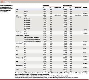 The participation rate was 49.3% with10,621 participants and 10,936 non-participants (Figure 1). Among people aged 40-79 years, the participation rate was 53.9% (57.0% among women and 50.6% among men) (Figure 1). The participation rates were higher among women than among men, except for people aged 80+ years. Compared to non-participants, participants were more frequently women (54.8% versus 49%), had a higher median age (56 versus 52 years), a higher frequency of suburban residence, a higher frequency of marriage/registered partnerships (68.2% versus 51.7%) and a lower frequency of co-morbidities (cancer, cardiovascular disease, diabetes and hypertension) (26.6% versus 28.0%) and death in the follow-up period (0.3% versus 1.3%) (Table 1).
