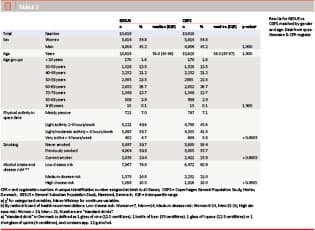 Compared to the urban population (n = 10,618, CGPS), the suburban participants (n = 10,618, GESUS) were less physically active, smoked less and ingested less alcohol (Table 2). Furthermore, they had higher anthropometric measures (BMI and WHR) (Table 3), less undiagnosed hypertension but more undiagnosed diabetes (Table 3), less frequency of elevated total and LDL-C but higher frequency of decreased HDL-C and elevated TG (Table 3).