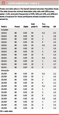 We have calculated ORs at 80% power and alpha 0.05 for different ratios of exposure and endpoints. In order not to commit a Type II error, calculation of study power, n and effect size will be necessary in future association studies. A larger sample size will be needed in order to detect a rare co-morbidity for a rare exposure compared to a common co-morbidity for a common exposure.