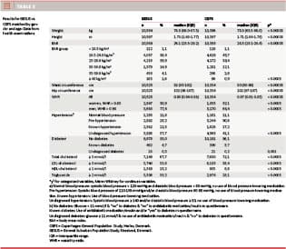 The CGPS [1] has recruited participants randomly from the general population of Copenhagen, Denmark since 2003. It has a response rate of 49.3% (response n = 10,621 of total n = 21,557). We included age- and gender-matched participants (n = 10,618) for comparison with GESUS on baseline characteristics. The differences in number (10,621 versus 10,618) are due to lack of match for three participants in GESUS.
