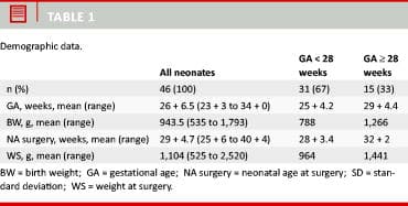 In the 10-year period, 60 premature babies were treated surgically for persistent ductus arteriosus at the GN. A total of 14 (23%) of the 60 neonates who underwent surgical ligation were excluded from this study, 12 (20%) because PDA was complicating another congenital heart disease, and two (3%) were excluded because their medical charts were missing. A total of 46 neonates were thus included in the study.
