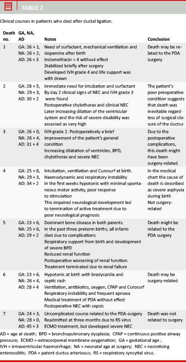 Conclusion: The need for ligation of a patent arterial duct in preterm neonates is subject to considerable risk. Total mortality in this vulnerable group of patients was 15%. Although no obviously procedure-related deaths were observed, severe complications and postoperative morbidity occurred.