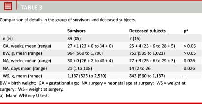 Among the 46 neonates, there were seven deaths (15%), which occurred between three and 119 days after birth. Six patients (13%) died during the same admission and one (2%) during a subsequent admission (Table 2 and Table 3).