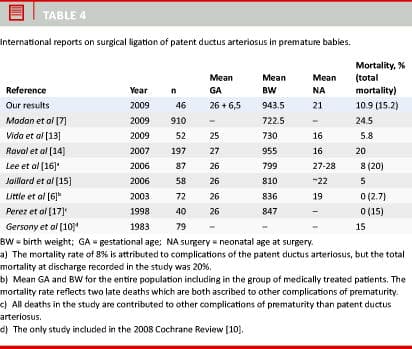 A recent study [11] found that the risk of death without surgical ligation was four times higher for medical non-responders than for responders, and thus speaks for surgical ligation of PDA after attempted medical closure. Similarly, Kabra et al [12] found that among 426 preterms with PDA, the mortality rate for the group without surgical ligation was 22% versus 14% in the group with surgical closure (p < 0.05). Kabra et al, however, noted that the neonates with symptomatic PDA who were treated with surgical ligation had an increased risk of neurosensory impairment, bronchopulmonary dysplasia and retinopathy of prematurity. Two new studies from 2009 also make conflicting conclusions [7, 13] (Table 4).