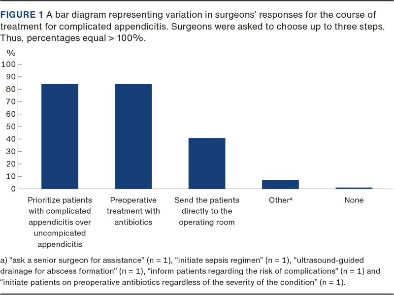 The management of patients with complicated appendicitis was explored and is depicted in Figure 1. Almost all surgeons would act differently if a patient was preoperatively diagnosed with complicated appendicitis. Many surgeons would prioritise these patients over uncomplicated cases (84%) and/or would start preoperative treatment with antibiotics (84%), and 41% would send these patients directly to the operating room.