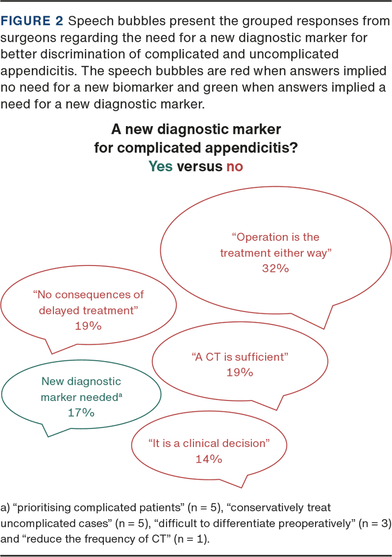 Most surgeons (83%) did not feel a need for a new biomarker to discriminate between complicated and uncomplicated appendicitis. They further elaborated that there would be no consequences of a biomarker since “operation is the treatment either way” (32%), and there are “no consequences of delayed treatment” (19%) (Figure 2). The remaining resident surgeons (17%) reasoned that there was a need for a new biomarker and that this would affect prioritising and treatment of patients. If a new biomarker was developed, more than half of the surgeons (64%) would stress the importance of precision, whereas 33% weighted readily available results. Furthermore, surgeons would anticipate new biomarkers to be inflammatory markers (80%), bacterial or viral markers (12%), or had no opinion (8%).