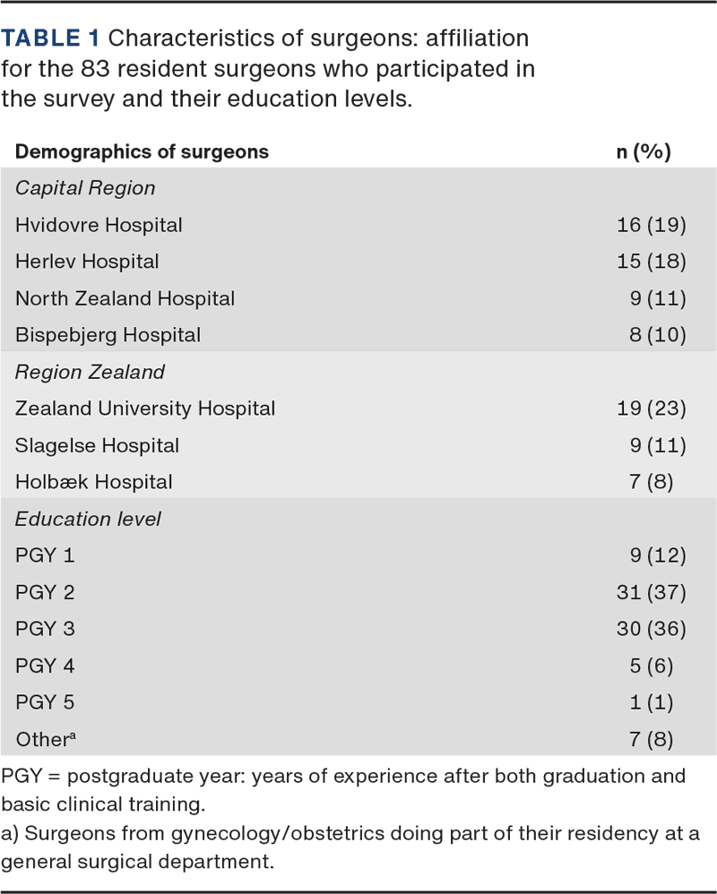 The questionnaire was distributed to 92 resident surgeons at seven hospitals that were eligible for inclusion. A total of 83 (90%) surgeons completed all three sections of the questionnaire, and their affiliation and education level are presented in Table 1. Non-responders were equally distributed among the departments (data not shown).
