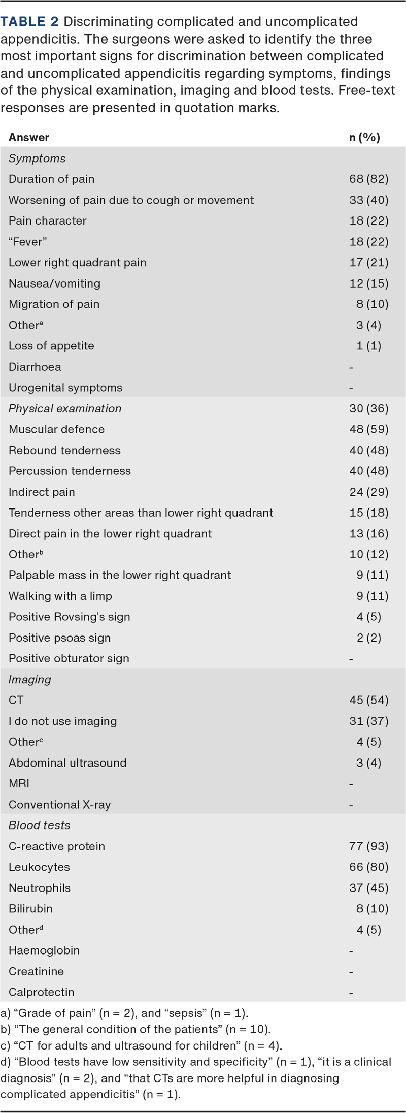 The resident surgeons were asked to identify the three most important 1) symptoms, 2) findings of the physical examination, 3) diagnostic imaging, 4) blood tests, and 5) other clinical measures that assisted their diagnosis of complicated appendicitis, see Table 2. Regarding the symptoms, most surgeons found the duration of pain (82%), worsening of pain with cough or movement (40%), pain character (22%), and “fever” (22%) to be important. In the physical examination, the surgeons weighed muscular defence (59%), rebound tenderness (48%), and percussion tenderness (48%) as important findings in patients with complicated appendicitis. For diagnostic imaging, 54% of surgeons used computed tomographies (CTs) to discriminate complicated from uncomplicated appendicitis, whereas 37% never used any imaging modalities for this purpose. Approximately 95% of the resident surgeons reported using routine blood tests when considering if a patient suffered from complicated appendicitis. Particularly, C-reactive protein (93%), leukocytes (80%), and neutrophils (45%) were rated as important by the surgeons. The remaining 5% of surgeons elaborated that “blood tests have low sensitivity and specificity”, “it is a clinical diagnosis” and “CTs are more helpful in diagnosing complicated appendicitis”.