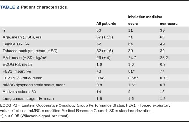 Furthermore, 50 consecutive patients were seen three months after lung cancer resection in the outpatient clinic of the Department of Respiratory Diseases and Allergy, Aarhus University Hospital, Aarhus, Denmark. A spirometry was performed by a trained nurse, and patients were asked if they used any inhalation medicine. In addition, the mMRC dyspnoea scale, smoking status and Eastern Cooperative Oncology Group (ECOG) Performance Status were assessed.