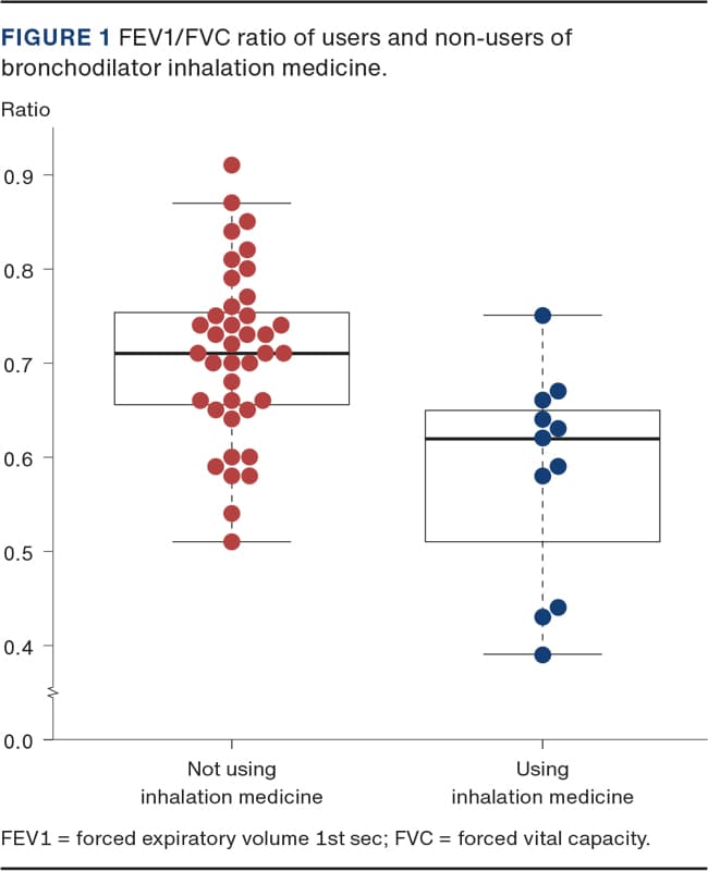Characteristics of the study patients are presented in Table 2. Additionally, characteristics of users and non-users of bronchodilator inhalation medicine are shown. At the three-month follow-up visit, eleven patients (22%) were using bronchodilator inhalation medicine, whereas 25 (50%) were obstructive on post-operative spirometry and 24 (48%) reported SOB. The forced expiratory volume, first second (FEV1)/forced vital capacity (FVC) ratios among users and non-users of inhalation medicine are depicted in Figure 1. Users of inhalation medicine had significantly lower FEV1% and FEV1/FVC ratio (p < 0.05), whereas their mMRC score was significantly higher (p < 0.05) than that of patients not using inhalation medicine. Further characteristics, such as age, BMI, ECOG Performance Status, smoking status, tobacco pack years and lung cancer stage did not significantly differ between the groups.