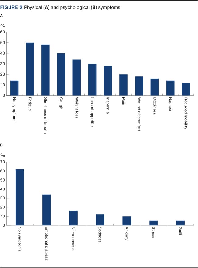 The results of the QoL questionnaire in which physical and psychological symptoms could be ticked off are depicted in Figure 2. The primary symptoms were fatigue, SOB and cough.