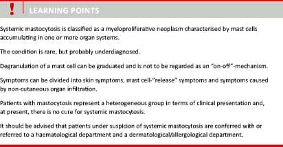 The mast cell lives a hidden life, but plays an important role in many physiological processes. The cell’s ability to react on various stimuli is demonstrated by its implication in a wide range of conditions such as asthma, rhinitis, atopic dermatitis, urticaria and anaphylaxis. The cell was described by Paul Erlich in 1878 [1], but had already been linked to allergies some years earlier [2]. It is not until recent decades, however, that the evolution of the cell has been described [3, 4] and its fascinating biology has only been depicted within recent years [5, 6]. We here give a review on systemic mastocytosis in regards to cell biology, diagnostic approaches and clinical management.