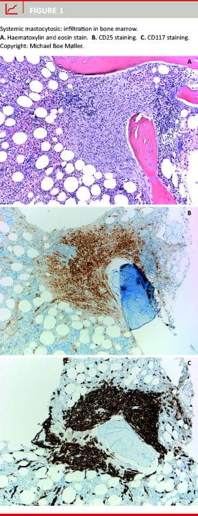 A histological examination of a crista biopsy will secure the diagnosis in the majority of SM cases. The examination includes immunohistochemical staining for tryptase, CD117, CD25 and CD2 as discrete mast cell infiltration can otherwise be overlooked [15, 26]. (Figure 1). A similar practice is relevant for biopsies obtained from other organ systems. Both normal and neoplastic mast cells stain positive for tryptase and CD117 and therefore afford an opportunity to estimate both mast cell count and pattern of infiltration. Normal mast cells do not express CD25 or CD2 and therefore provide ability to discern between neoplastic and normal mast cells. Mast cell infiltration in the setting of ISM is frequently multifocal and compact, but not rarely exhibits a more discrete and interstitial pattern. ASM and MCL more commonly display a relatively compact and widespread infiltration [26]. The histological examination is supplemented by flow cytometry on marrow aspirate, which can establish the neoplastic phenotype with higher sensitivity and specificity [18, 27]. When examining bone marrow material, it is important that attention is also paid to the presence of possible non-mast cell clonal haematological disease.