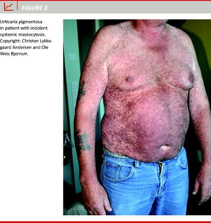 Skin symptoms are predominant. Most common is urticaria pigmentosa (Figure 2) which besides being a characteristic feature of CM occurs in 90% of patients with SM and up to 50% of patients with either SM-AHNMD or aggressive SM (ASM). It is therefore important to emphasize that SM-AHNMD and ASM not rarely present themselves without skin manifestations [23]. Pruritus is the most common complaint provoked by e.g. changes in temperature, hot baths, physical activity, certain foods, alcohol or drugs.