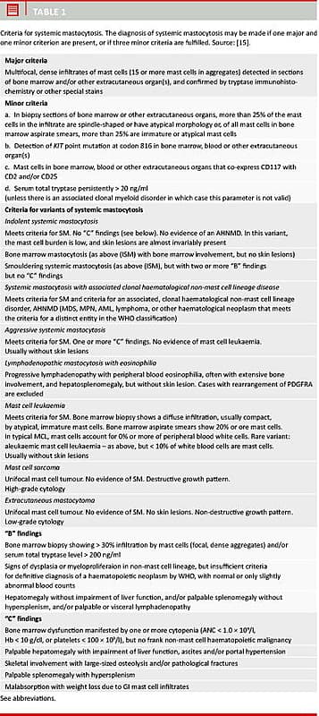 The condition affects men and women equally. Children are especially affected by the cutaneous form (CM) and the disease will manifest itself in the first year of life in over 80% of cases. For the majority of children, the condition will improve or remit spontaneously before adulthood [20]. In contrast to this, mastocytosis among adults is more often systemic and tends to persist [21]. Among all cases of SM, it has been reported that indolent systemic mastocytosis (ISM) and SM with an associated (clonal) haematologic non-mast cell lineage disease (SM-AHNMD) (Table 1) comprise approximately 85% of patients and are equally frequent [22].