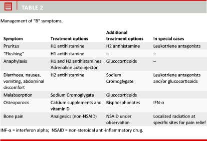 Cutaneous elements are managed with antihistamines for pruritus. In more severe cases, resort may be made to PUVA-therapy and topical steroids under occlusion. For more on this subject, we refer to the dermatological literature. Patients with ISM and stable SSM are treated symptomatically with mediator-regulating drugs, whereas a cytoreductive approach generally is not recommended for these more benign forms. Patients with bone affection are treated with calcium supplements and vitamin D. If osteoporosis is diagnosed, defined as a T-score below two, bisphosphonates are added [35] (Table 2).